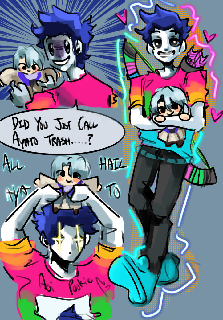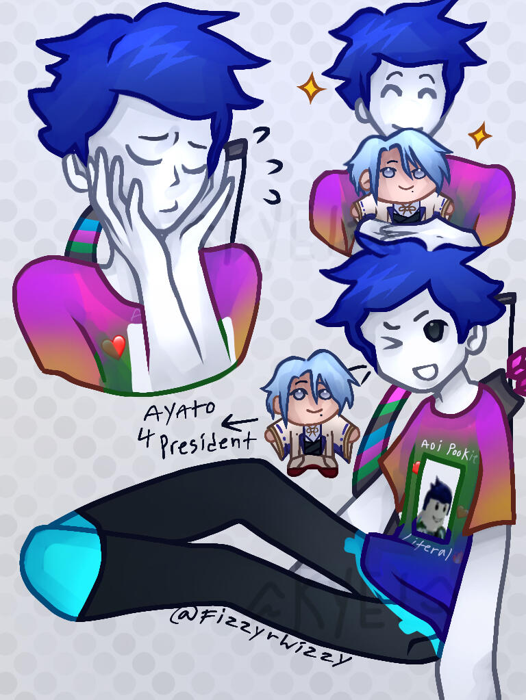 Info:Loves: Ayato, Roblox, Royale High, Bloxburg, FTF, Blade Ball, Genshin Impact, Honkai Star Rail, Minecraft, PRSK, scaring people, horror games, honeycomb ice cream, maid dresses and cat ears, mac n cheese (not kraft), smiley face stickers, 2016 rainbow unicorn cakes, rhythm games, otter pops, Honami Mochizuki, sweets, bright colors, sour candy, shiba inu's (Timmy :3), nyan cat, drawing, friends, talking, queers, bees, frogs, sparkles and ":3"