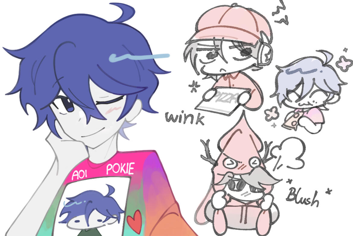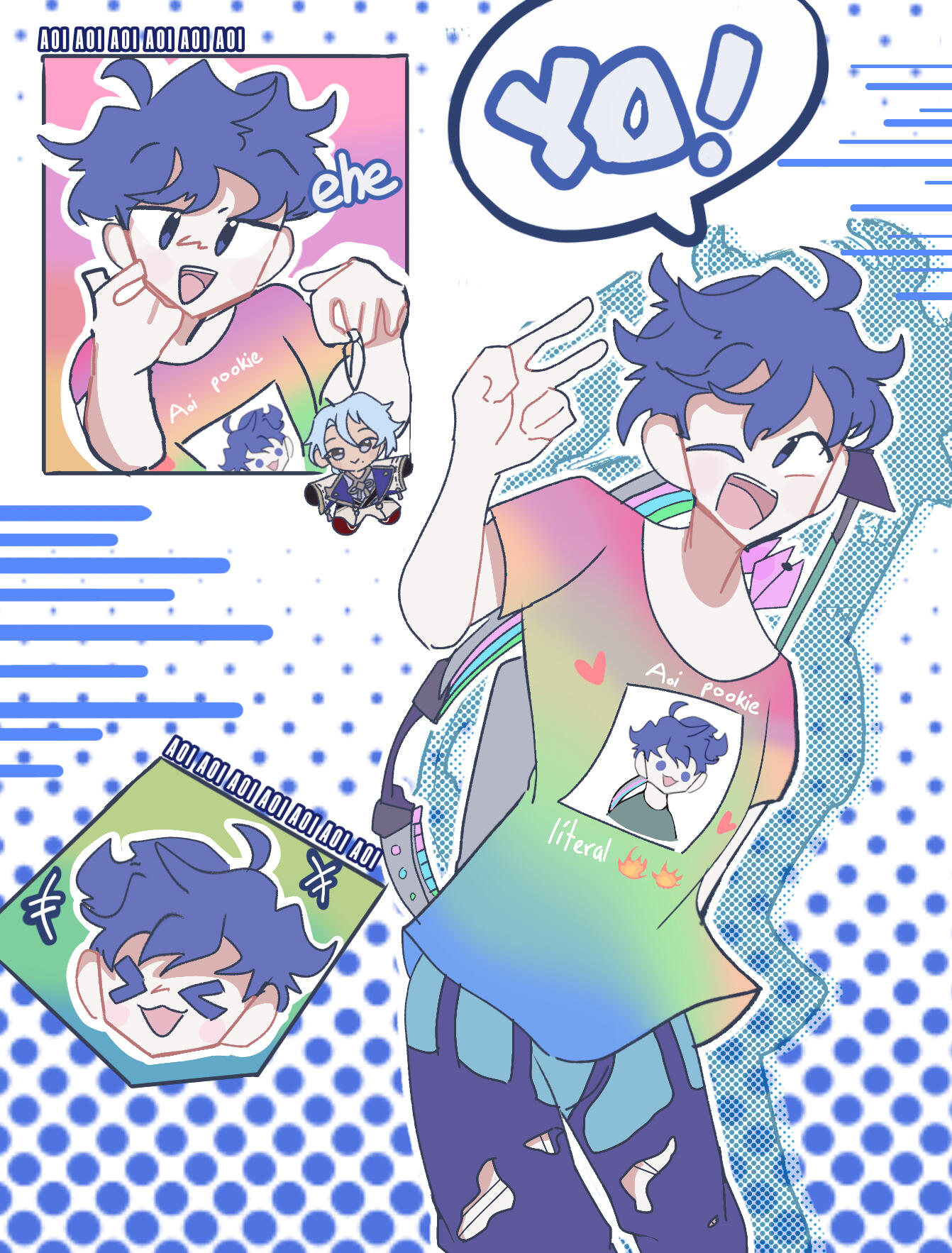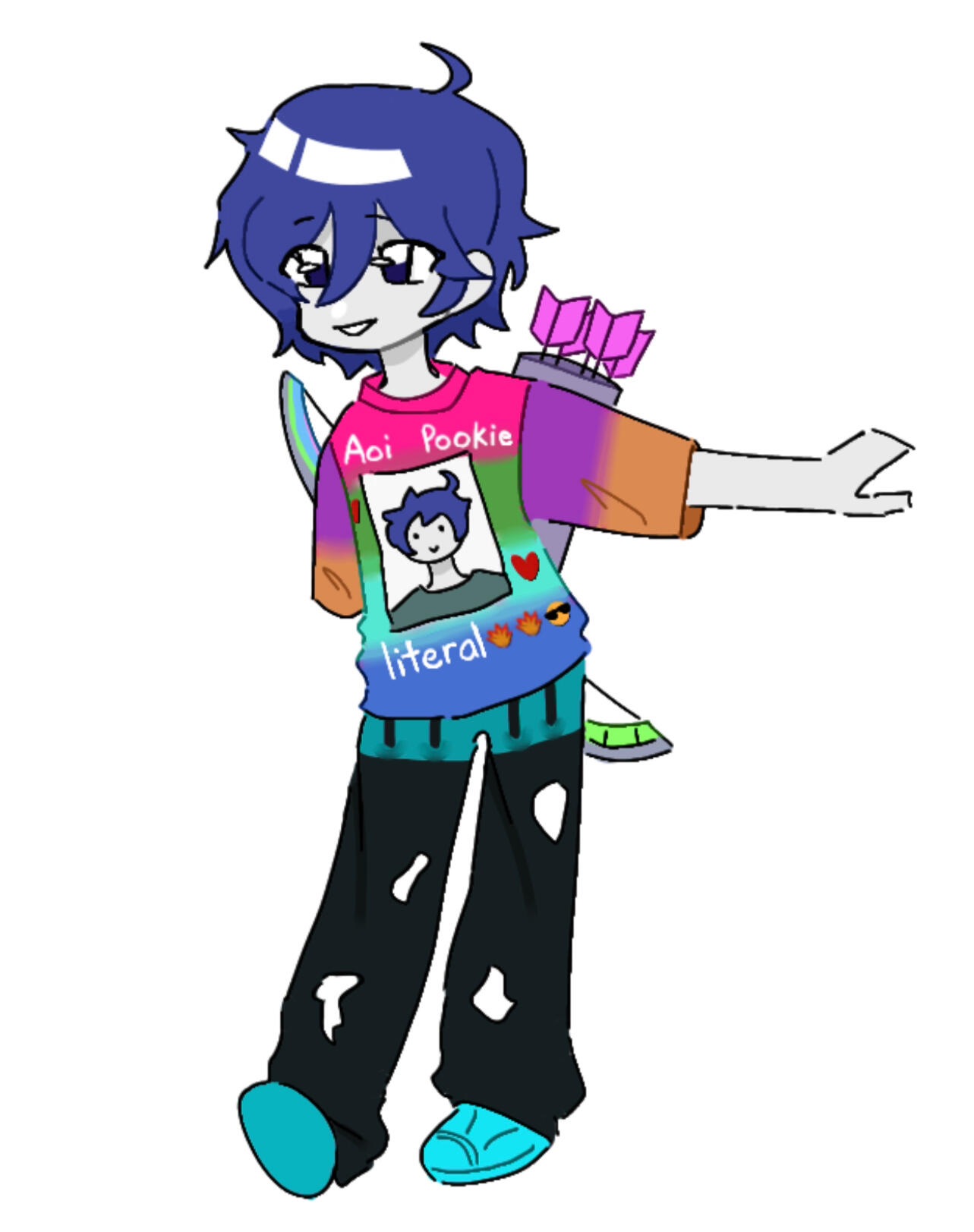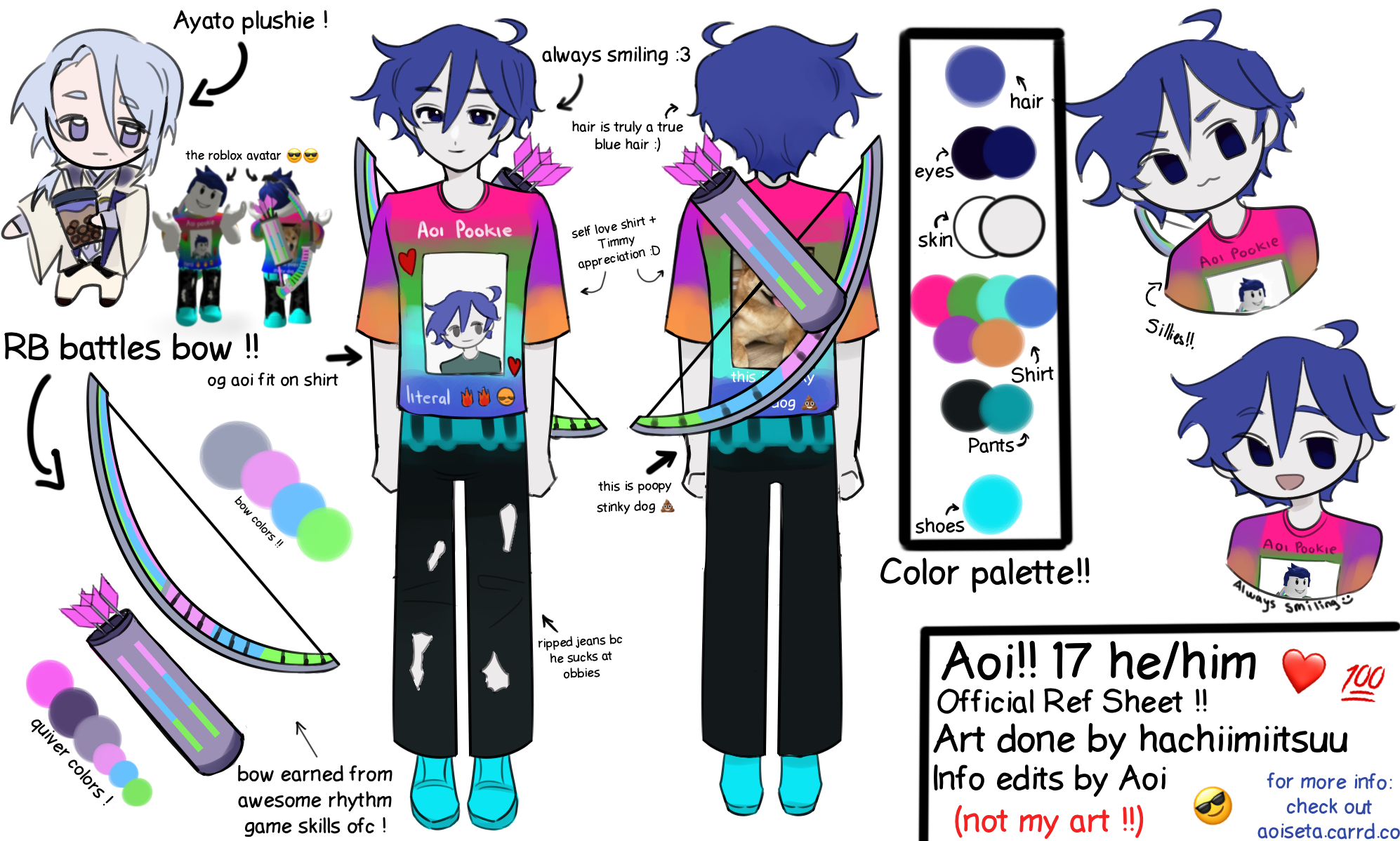 Personality / FactsPersonality: INFP, silly, funny, has an awful sense of humor, kinda creepy (LOOKING), awkward around strangers, dumbs himself down to seem likeable, hyperfixtates on Ayato, repeats songs, loves people (if introduced), speaks weird in roblox chat, sounds like he's 11 (he's NOT), is Bi, radiates color, totally super kawaii sugoii !!!!!!!!!Facts: Would totally be a horror game jumpscare, he's a master at archery, Aoi used to wear a green shirt, his dog is on the back of his shirt !! He has robux but looks like a gay loser, shirt is custom made (self love :3) , a boy/girl kisser, is always smiling and happy, my self-sona, gambling addict, loves🔥😎💯❤️emojis, would snort kool-aid up his nose, if he wore something else he would wear the Green Jersey or ugly rainbow sweaters, is #FFFFFF white, a little zesty (just a little), eats pizza uncrustables, on the brink of diabetes, dyes his hair himself 100%, always carry Ayato in his pocket ^^ he's my selfsona but has some fun traits to his character too !!Relationships: Is best friends with Matt, the chef/pizza boxer/delivery boy. Matt is like a brother to him, and he usually whines to Aoi about his situationships. Is canoically Kat's SIBLING (Stop shipping them wtf). Erick's best bud, they hang out occasionally due to Erick's busy schedule. Super duper dislikes Aoi's previous female personas, for obvious reasons, (2016 Jailbreak Era...). Talks to Ayato plushie like he's a lunatic, he throws tea parties with all the other Ayato plushies he has. Rarely talks to Bacon ever since he died in 2022. (only real ones know how he died)Matt left his pizza's phone number here... 666-666-PIZZA